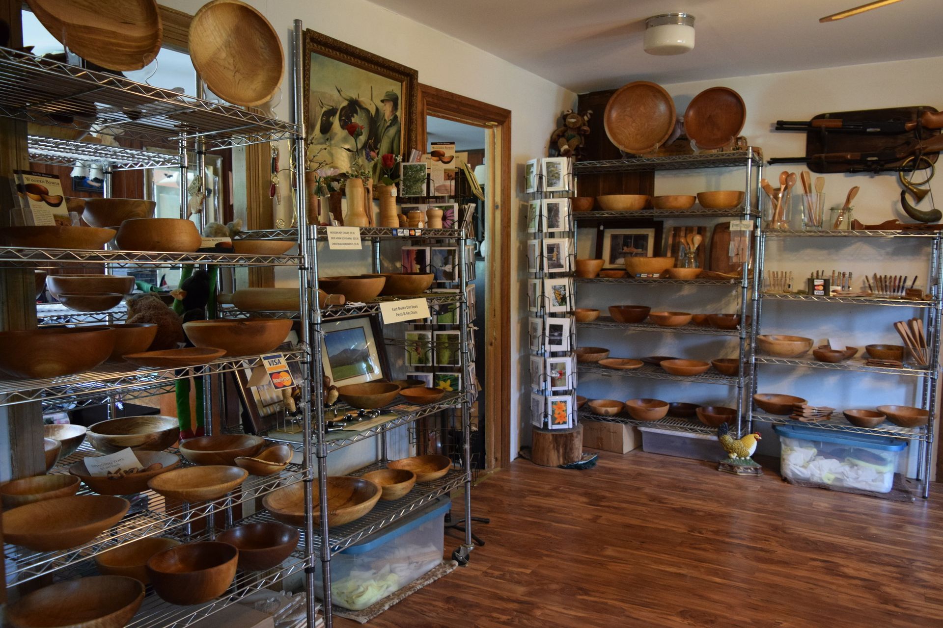 Our showroom hosts a variety of handmade VT wooden bowls, platters, dishes, and other items turned out of wood. Visitors are impressed by the variety of wooden bowls, their shapes, sizes, and especially their quality. We use only food-safe oils on our wooden bowls, so these bowls are both beautiful and functional. Visitors to the studio also enjoy the unusual bowls with special shapes, some made from burls, and some turned from tapped Sugar Maple trees with the tap holes from years ago still showing in the finished bowl. Some of our pens, bottle stoppers, fan pulls, and key rings are turned from deer or moose antlers or from unusual pieces of wood with gorgeous unique grains.